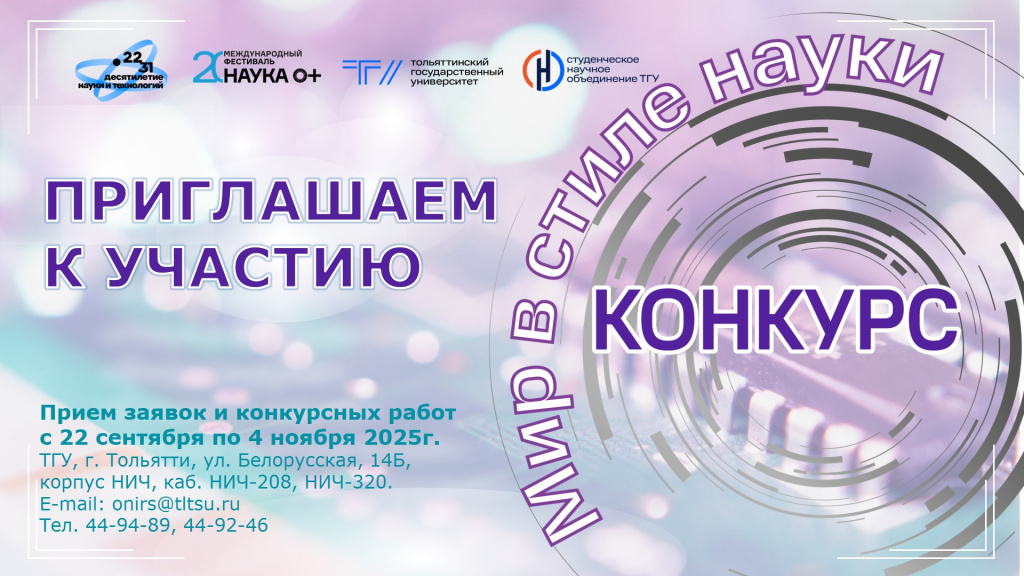 Любители науки и творчества приглашаются к участию в региональном конкурсе «Мир в стиле науки». Это шанс для всех желающих продемонстрировать свой взгляд на науку через искусство – фотографию, видео, литературное произведение или даже театральную постановку. Конкурс проводится Тольяттинским государственным университетом в рамках юбилейного 20-го Международного фестиваля НАУКА 0+, одного из ключевых событий Десятилетия науки и технологий в Российской Федерации.