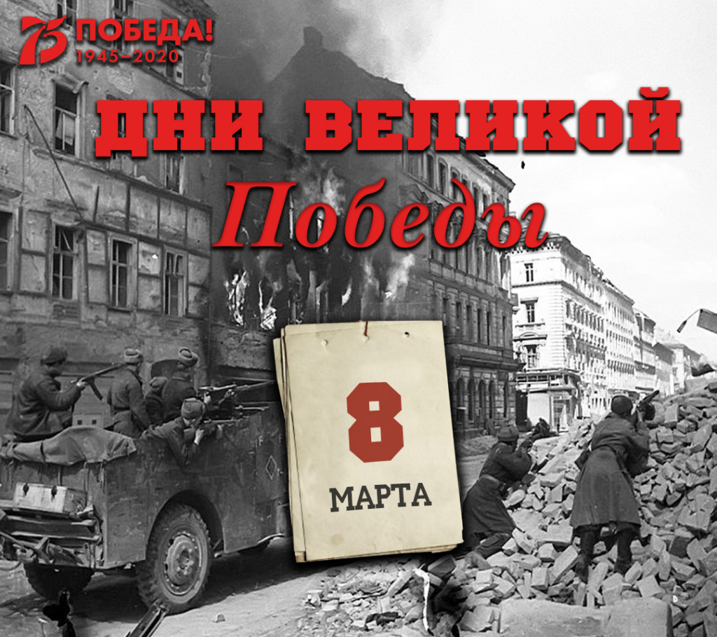 За 8 марта 1945 года на всех фронтах подбито и уничтожено 128 немецких танков. В воздушных боях и огнём зенитной артиллерии сбит 61 самолёт противника.