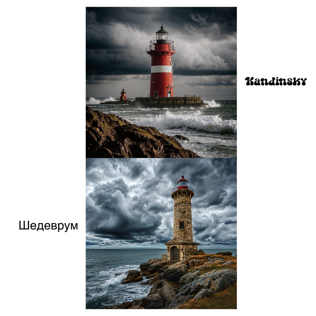 Работают оба сервиса одинаково: вводим запрос (например, «старинный маяк на фоне штормового неба»), и Kandinsky или «Шедеврум» создадут нечто совершенно новое. Но для впечатляющих результатов важно точно формулировать запрос.