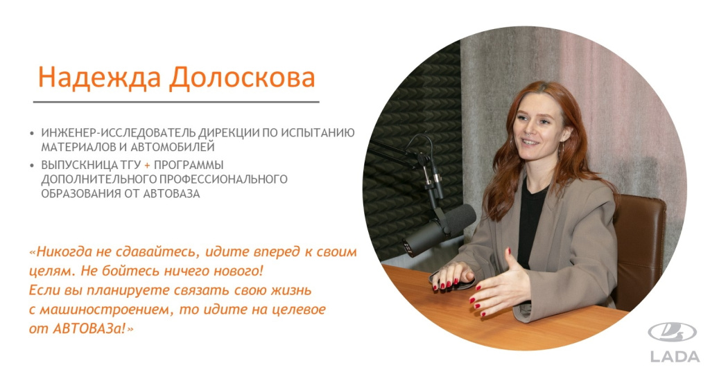 В новом выпуске подкаста Надежда Долоскова, выпускница ТГУ, инженер-исследователь в дирекции по испытанию материалов и автомобилей инженерного центра LADA, победитель Всероссийского конкурса «Инженер года» по версии «Инженерное искусство молодых», победитель научно-практической конференции инжиниринга АВТОВАЗа в 2024 году, победитель Школы командной работы.