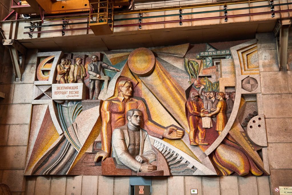 Осмотр Жигулёвской ГЭС начался с административного здания станции, в котором расположены производственные помещения и основное оборудование. Непосредственно у входа на глаза попадается замечательная мозаика 13 метров в высоту и 40 в длину, изготовленная из гранита 88 различных оттенков. Её автор Вячеслав Герасимов – известный самарский художник-монументалист.