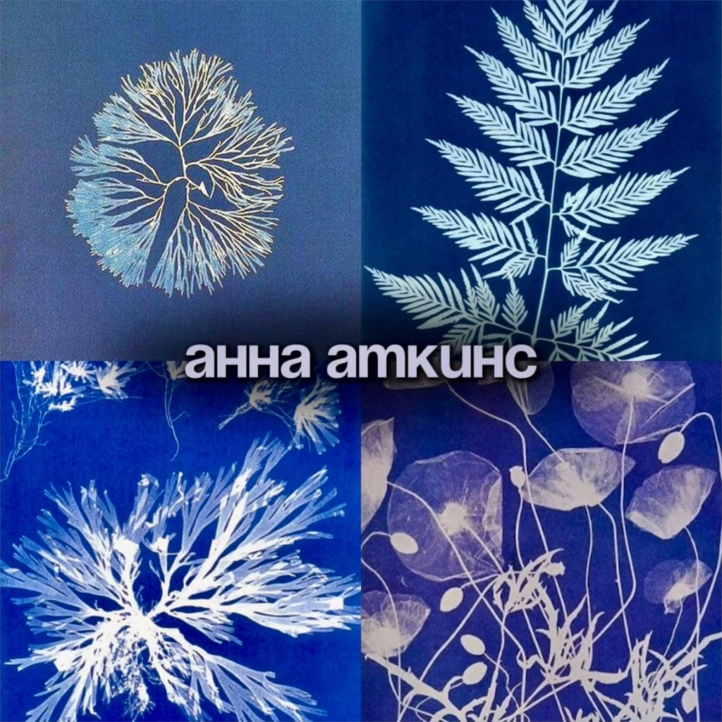 Зато фотографии Анны Аткинс мы можем рассмотреть во всех подробностях. Она увлекалась биологией и опубликовала первую в мире фотокнигу – «Водоросли в Британии» с фотограммами, выполненными в технике цианотипии. Цианотипия – это фотографический процесс, основанный на использовании светочувствительных солей железа.