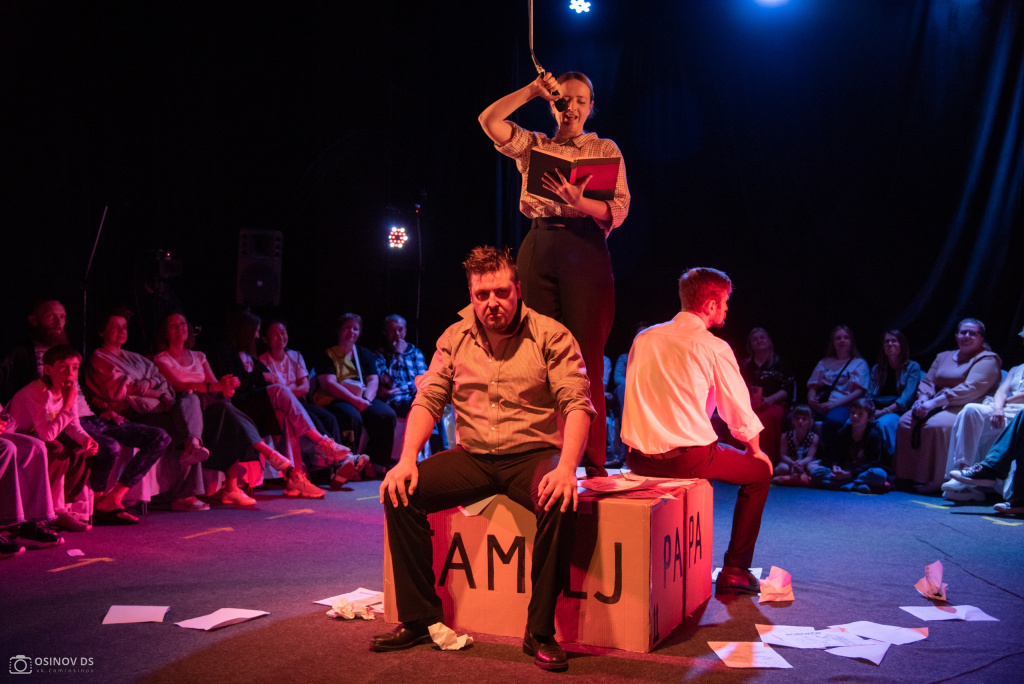 Вторая конкурсная работа – постановка Василия Лимонова (Вологда) «Что мой сын должен знать об устройстве этого мира» (12+) по книге Фредрика Бакмана. Сборник рассказов шведского писателя можно назвать руководством для ребёнка, которое должно помочь ему лучше понимать окружающий его мир и, в частности, мотивацию его отца. Оригинальное произведение – по сути, монолог обо всём. Именно поэтому его непросто поставить, но режиссёр блестяще справляется с задачей, выбрав при этом нетипичный формат: действие происходит на камерной сцене «Дилижанса», а зрители сидят на расставленных по кругу стульях, «замыкая» сценическое пространство.