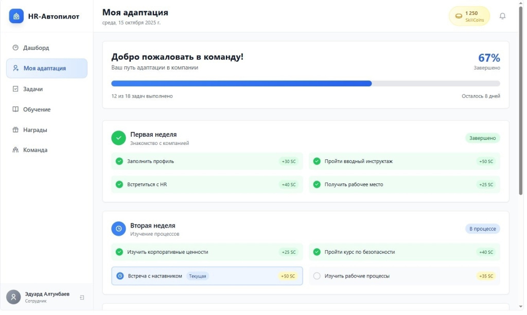 Проект «HR-Автопилот» представляет собой систему автоматизации адаптации сотрудников. Руководитель проекта и автор концепции – студент магистратуры ТГУ Эдуард Алтунбаев.
