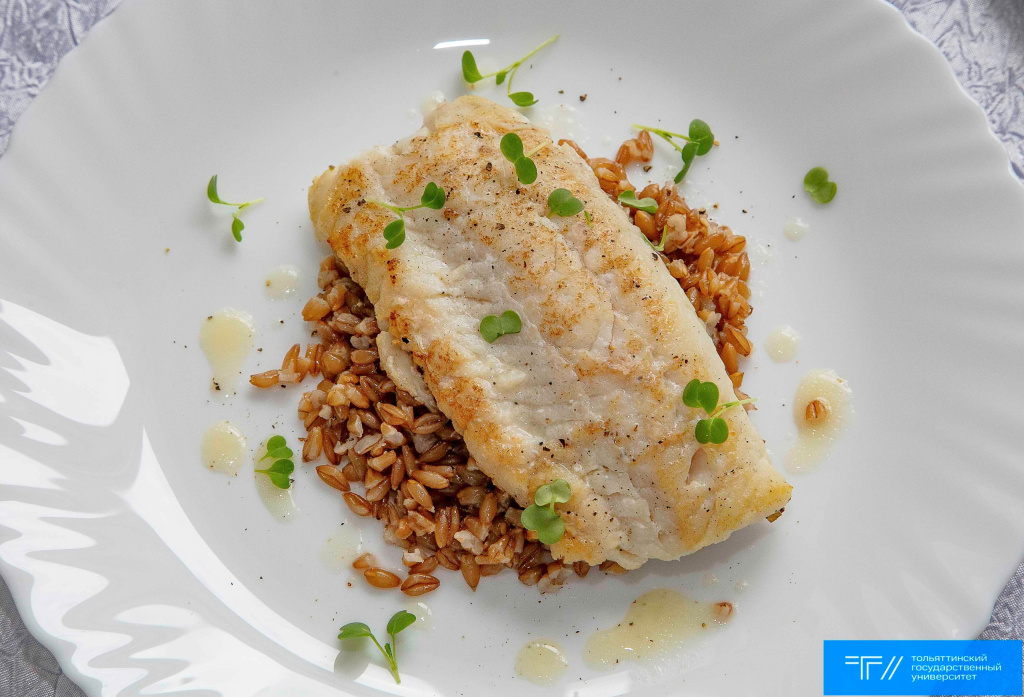 А вот выпускник ТГУ Павел Мальцев хотел бы популяризировать традиционные русские блюда и подавать их гостям в современном исполнении. Его концепция ресторана русской кухни предполагает использование преимущественно местных продуктов, например пойманной в Волге рыбы. Одно из блюд Павел приготовил для дегустации экзаменационной комиссии: волжский судак с полбой впечатлил и подачей, и вкусом.