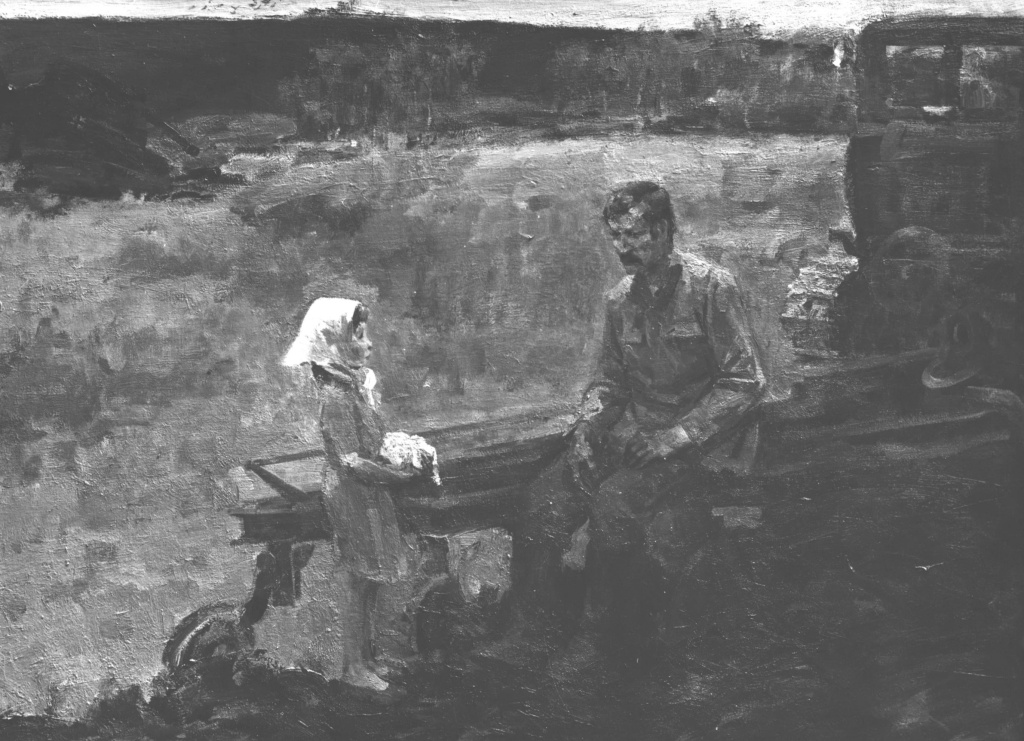 – Дело-то в том, что я сам родом из деревни. Я послевоенный ребёнок, рождён в 1949 году. И всё ещё было памятно и знаково. Когда я был в таком возрасте (лет шести-семи), как эта девочка, которая стоит перед папой-трактористом в военной форме, мы приходили с моим другом к его отцу. Приносили ему что-то перекусить в обеденный перерыв. Тогда ещё не было ни полевых станов, на которых механизаторов бы кормили, не было вообще никаких удобств. Видите: и трактор из того времени, и герой мой. Он напоминает образ отца моего друга. Эти воспоминания остро всплыли у меня, когда появилось желание писать работу на эту тему, когда надо было выполнять дипломный эскиз.