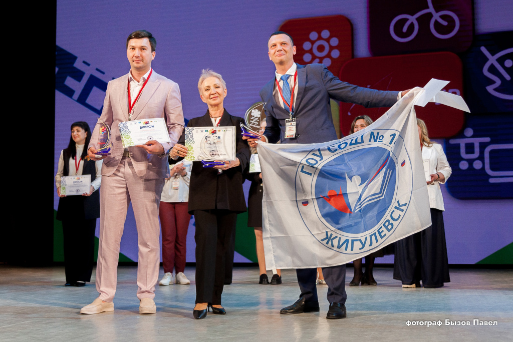 В. Е.: Я с собой в Уфу взял два флага с эмблемой своей школы. Когда всех конкурсантов данной номинации пригласили на сцену, и мы, все восемнадцать человек, поднялись, я с собой взял этот флаг. Да, у меня была надежда, что мне удастся его развернуть в момент, когда будут оглашать призёров в номинации. В каждой номинации три призёра, и среди них ещё объявляется абсолютный победитель номинации. Так вот, когда объявляют сначала одного представителя, потом второго, ты понимаешь, что остался только кто-то один, какую-то одну фамилию сейчас назовут, а ещё шестнадцать человек стоят рядом с тобой, думают точно так же, надеются. Но так сложилось, что судьба ко мне повернулась, и мне удалось растянуть флаг нашей школы на сцене конгресс-холла (государственное бюджетное учреждение Республики Башкортостан «Конгресс-холл Торатау». – Прим. ред.) в Уфе. Благодаря этому конкурсу всё российское педагогическое сообщество узнало, что в Самарской области есть маленький город Жигулёвск, в котором есть прекрасная школа № 14.