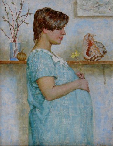 Когда я спросила у Игоря Геннадьевича, что больше всего он ценит в своей жене, он тут же встал, достал книгу со своими картинами и показал мне портрет Валентины. Я всегда относилась к репродукциям не особо то положительно, все-таки это не то, что смотреть на картину в живую. Но, чтобы прочувствовать всю нежность портрета любимой женщины художника, было достаточно и репродукции. Я вижу нежные оттенки ее одежды, чуть розоватую кожу лица. Умиротворенность, нежность и покой, соответствующие изображенному моменту – ожидания рождения ребенка. И сам ИГ с такой теплотой в голосе ведает мне историю картин, что хочется взять и так же написать портреты близких мне людей. Но… я не мастер, мастер – он – Игорь Геннадьевич!