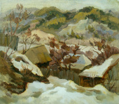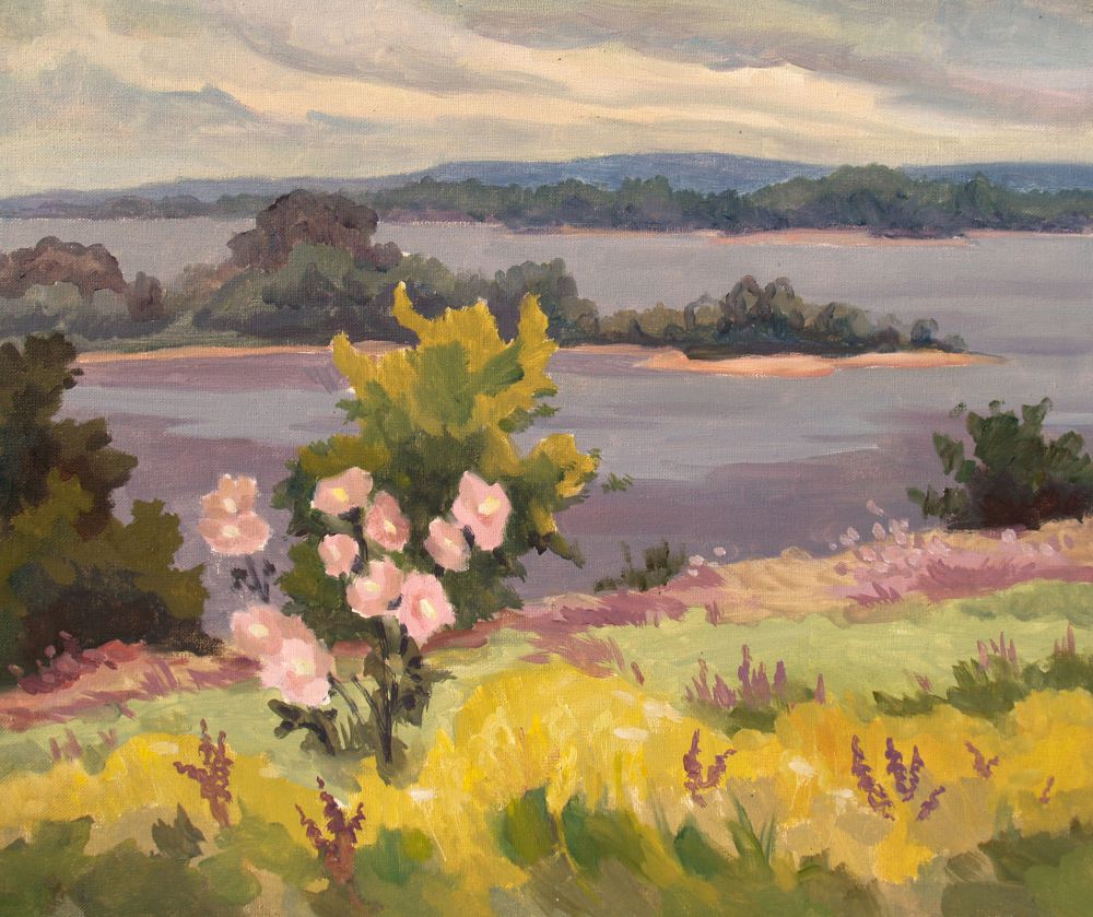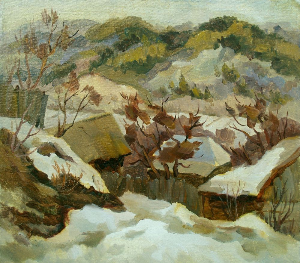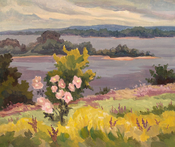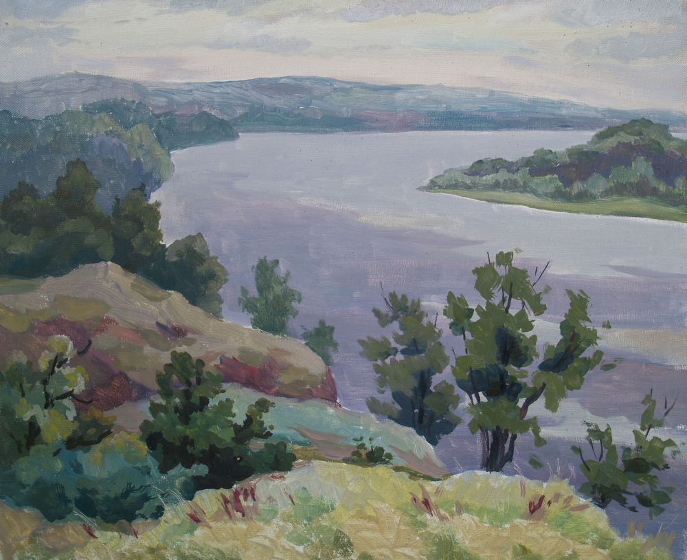 Я приехала в Яблоневый овраг и обомлела. С двух сторон от дороги горы и леса, а впереди, где-то вдали видно Волгу. С дачи ЮрьСаныча видны эти просторы, и, как оказалось, в домике находится его мастерская с картинами, на которых изображены все эти красоты: горы, домики, крыши, речка и, над всем этим небольшая дымка – именно она оживляет картину.